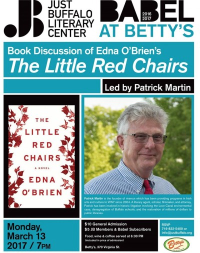 Patrick Martinounder, founder of riverrun, literary agent, scholar, filmmaker, and attorney lead a discussion of Edna O'Brien's "Little Red Chairs" in preparation for her visit to Buffalo on March 24th.