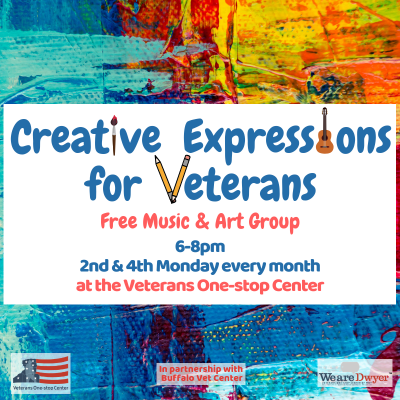 Creative Expressions is a free music and art group for veterans led by the Veterans One-stop Center's peer support program We are Dwyer and the Buffalo Vet Center. Veterans are invited to express themselves through stories, pictures, music, art, and more! Music and art are effective tools in relieving stress and anxiety and we invite veterans to take advantage. All are welcome to join! Creative expressions meets the 2nd and 4th week of every month at the Veterans One-stop Center. More information can be found by contacting WeAreDwyer@vocwny.org or by calling 716-898-0110 ext. 108