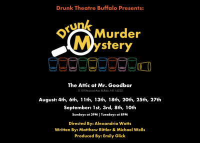 Drunk Theatre Buffalo is back again with their 3rd Mainstage Production after sold out runs of Drunk Peter Pan and Drunk Wizard of Oz. The company returns to Mister Goodbar this summer with the all new show written by Matthew Rittler and Michael Wells. Tickets go on sale Monday June 3rd at noon. Drunk Murder Mystery brings together all the classic elements of your favorite mysteries with a dash of Drunk Theatre Buffalo shenanigans and a twist on classic whodunit!