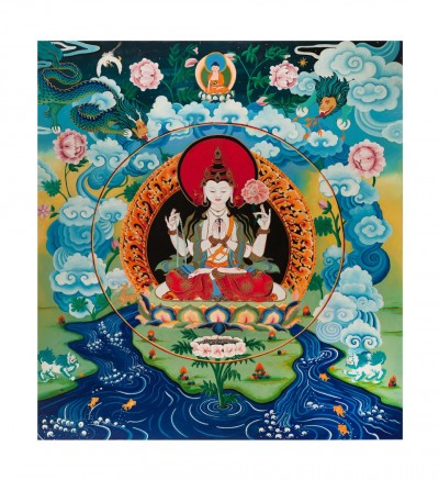 The influence of thangka, a traditional Tibetan form of art dating back to the eleventh century, is the basis for Joanna Angie’s artwork. In addition to being known for aesthetic beauty, thangka paintings, serve as objects of devotion, aids to spiritual practice and sources of blessings to those who meditate upon them. Through her paintings, Angie combines elements of thangka with traditional western styles to convey images of compassion, community, and knowledge.