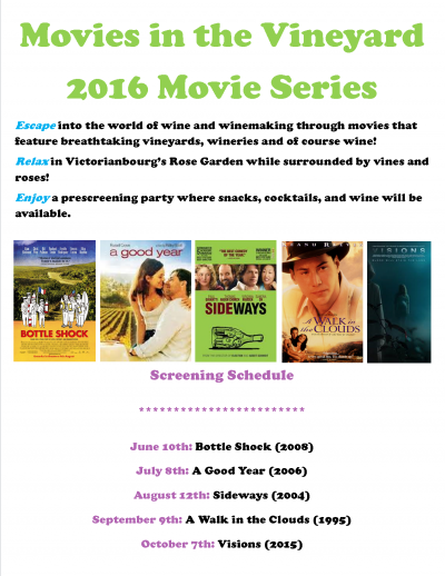 4402 East Lake Road Wilson, NYFor all of our customers who love wine just as much as we do we have created a movie series where each film showcases breathtaking vineyards, wineries, and of course wine! Relax and unwind as you escape into the on-screen world of wine and winemaking while sitting under the stars surrounded by Victorianbourg’s vineyards and rose gardens. Glasses and bottles of wine will be available for purchase so you can sip along with the characters in each film. Furthermore, the series covers a wide variety of genres ranging from horror to romance to comedy, so there is something for everyone. The best part is the screenings are free and all are welcome to attend! As a kick off to each film we will be hosting a pre-screening party where snacks and wine will be available. This is a rain or shine event...if we can't screen the film outside we will move indoors. We hope you can make it!