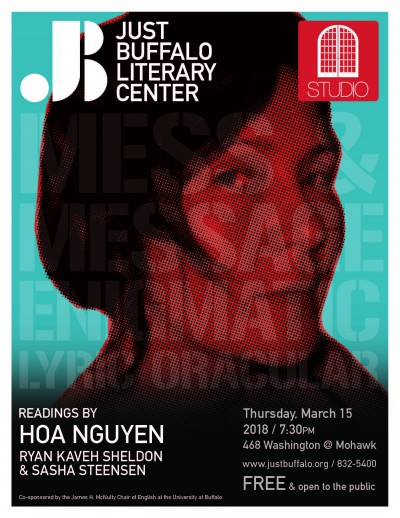 Just Buffalo Literary Center’s STUDIO series returns on March 15th, 2018 at 7:30pm at the Just Buffalo Writing Center (468 Washington St, 2nd floor) with Hoa Nguyen, Sasha Steensen, and Ryan Kaveh Sheldon.