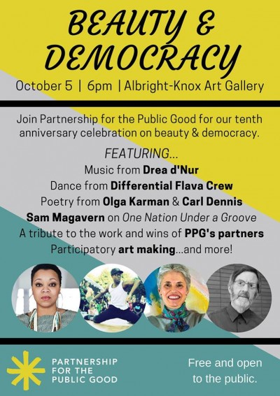 1285 Elmwood Avenue Buffalo, NY 14222Join Partnership for the Public Good for their tenth anniversary celebration of beauty and democracy. This special evening will feature music from Drea d'Nur, dance from Differential Flava Crew of Verve Dance Studio, poetry from Olga Karman and Carl Dennis, Sam Magavern on "One Nation Under a Groove," and participatory art making.