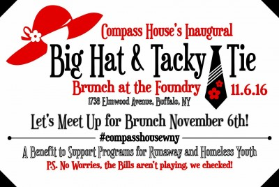 Tickets can be purchased at https://compasshouse.givezooks.com/events/2016-big-hat-and-tacky-tie-brunch. Questions? Contact Candice Fletcher-Pacheco, Development Director, at 716-886-1351.