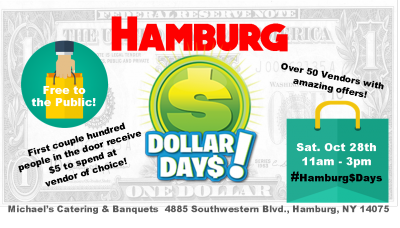 We’re showing off what Hamburg has to offer right before the Holiday shopping rush! Over 50 locally established businesses will come together in one place to offer special deals, discounts, and clearance on some specialty items and give you a sneak peek at what is coming out for Holiday Shopping! Each has something to offer for under $5 plus other items for sale. There will be a concession stand with sandwiches, soups, and beverages and the first 225 people in the door receive a free $5 voucher to spend at any vendor of your choice at the event! Take advantage of these deals and free money at Michael’s Banquets & Catering on Saturday Oct. 28th! Use the hashtag #Hamburg$days to spread the word!