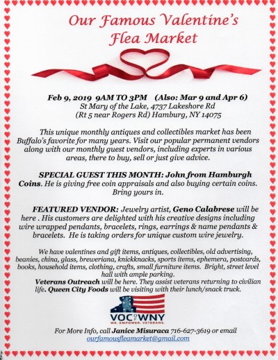 This unique antique and collectibles market has long been considered Buffalo’s Favorite. February is Free Coin Appraisal Month. John from Hamburgh Coins will be here. He is also buying certain coins. FEATURED VENDOR: Jewelry artist, Geno Calabrese. His customers are delighted with his creative designs including wire wrapped pendants, bracelets, rings, earrings & name pendants & bracelets. He is taking orders for unique custom wire jewelry. Visit our popular permanent vendors along with our monthly guest vendors, including experts in various areas there to buy, sell or just give advice. We have antiques, collectibles, valentines, old advertising, beanies, china, glass, breweriana, knickknacks, sports items, ephemera, postcards, books, magazine, toys, jewelry, tools, household items, clothing, crafts, small furniture items. Veterans Outreach will be there to assist returning veterans. Bright, street level hall with ample parking. Visitors parking in front of the hall in the lot on Lake Shore Road and behind the church, in the lot on Kennison and Norton. WELCOME to our friends from Canada. For more info, call 716-627-3619