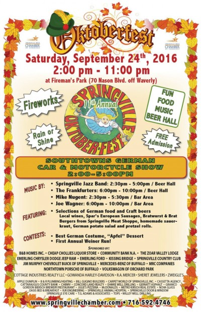 The Springville Area Chamber of Commerce 11th Annual Oktoberfest will take place on Saturday, September 24th from 2-11pm at the Springville Fireman’s Park, 70 Nason Blvd. just off Waverly Street.
