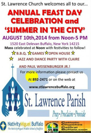 August 10, 2014 St. Lawrence will be celebrating our annual Feast Day. The celebration starts promptly at Noon with our Feast Day Mass. Festivities after Mass include the Colored Musicians Club of Buffalo, dancing featuring the music of the Weisenburgers, kids activities, and booths from parish and neighborhood groups. Barbecued ribs, hamburgers, hot dogs, side dishes and beverages will be available for purchase. There will be a money raffle, tour of the campus, and door prizes.##