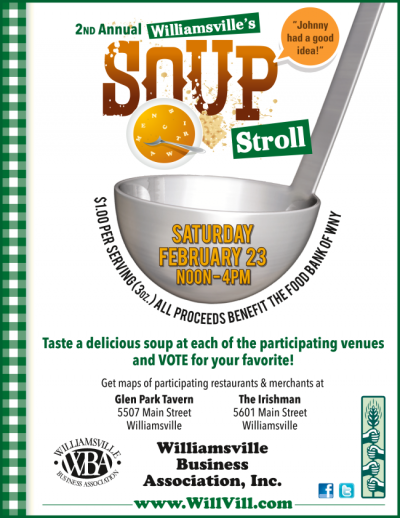 Don't miss the 2nd annual Williamsville Soup Stroll on Saturday, February 23rd, from noon to 4:00pm. Presented by the Williamsville Business Association, soup will be served up at $1 per serving and all proceeds go to The Food Bank of WNY.