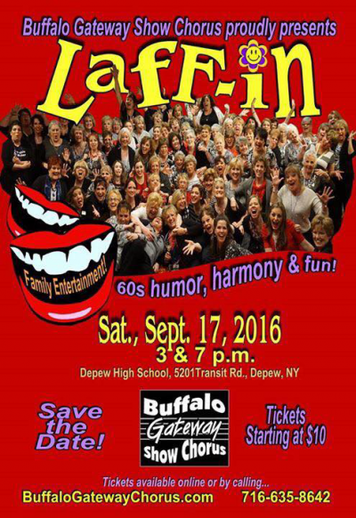 The Buffalo Gateway Show Chorus is an international award winning female barbershop harmony chorus of 90 women singers. They will be presenting the Laff-in" show at 3PM and 7PM on Saturday, September 17, 2016 at Depew High School, 5201 Transit Road, Depew, NY.