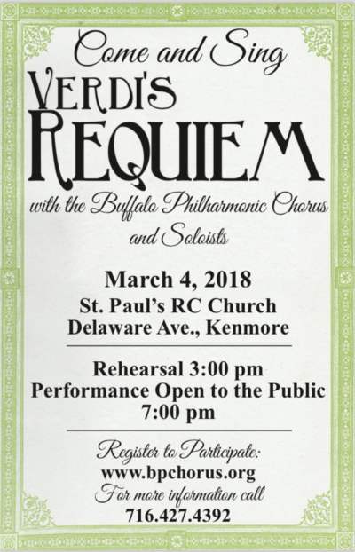 Do you like singing? Try out the BPC for an afternoon full of joyous music with a classical standard - Verdi's Requiem! The Buffalo Philharmonic Chorus is inviting singers of all experience levels to Come and Sing Verdi's Requiem side by side with our members. Registration is $10 per person* and includes a choral score and dinner. Register online at www.bpchorus.org