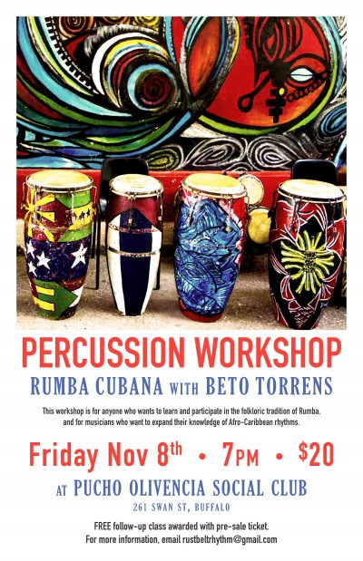 We will host an open jam and El Batey's 1st Bomplenazo after the workshop; come enjoy different styles of Puerto Rican folklore to start off the holiday season! $20 admission to the complete event (workshop and after-party), and a $5 suggested donation for the Bomplenazo solo. 261 Swan St. Buffalo (off street parking available).