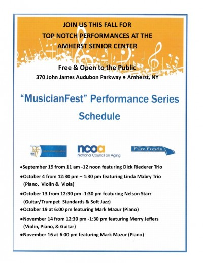 The Amherst Center for Senior Services will host several top-notch performers this fall, thanks to the National Institute of Senior Centers (NISC) partnership with the Music Performance Trust Fund (MPTF) and the Film Fund, which provides grants for up to 500 live music performances at senior centers across the United States. The Amherst Senior Center applied to the local American Federation of Musicians (AFM) and will host the following FREE concert on November 14 from 12:30 pm -1:30 pm featuring Merry Jeffers (Violin/Piano/Guitar). All concerts are free, open to the public and will be held at the Amherst Senior Center at 370 John James Audubon Parkway, Amherst, New York.