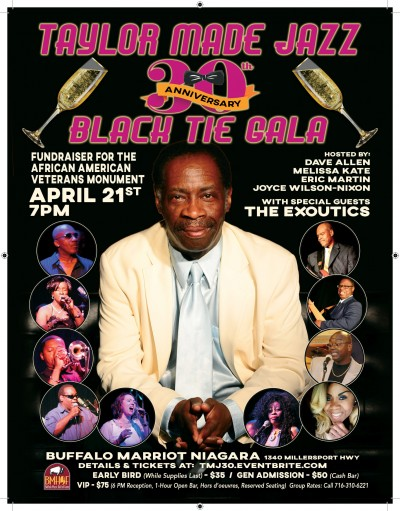 Taylor Made Jazz is Celebrating 30 years of musical success April 21st 2018 at the Marriott Hotel 1340 Millersport Hwy Amherst NY. Special Guest Buffalo Music Hall of Famers The Exoutics Save the Date and Spread the word. This is Also a fundraiser for the first African American Veteran’s Monument to be located at the Buffalo and Erie County Naval and Military Park. Will you step up and sponsor this important event? The goal for the monument is $1.5 million dollars
