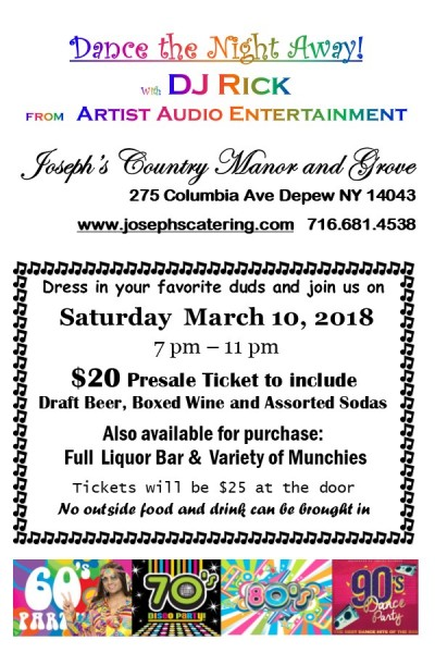 Dress in your favorite duds and join us on Saturday March 10, 2018 from 7 pm to 11 pm