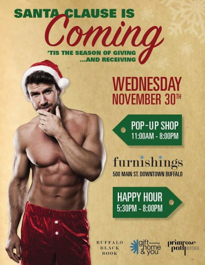 Need to fill a well hung stocking? Need that nighty before Christmas? Stop by Furnishings for some fun, giggles and shopping at an adult-oriented pop-up. Get your photo taken with a chiseled Santa Claus, enjoy some bubbly, view an erotic collection of adult items from Primrose Path Boutique, and get your latest copy of Buffalo Black Book.