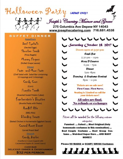 Come in Costume to Joseph's and enjoy a delicious three course themed dinner, Cash Bar with themed drinks and dance the night away with our DJ. We will have a variety of costume contests with prizes throughtout the evening!