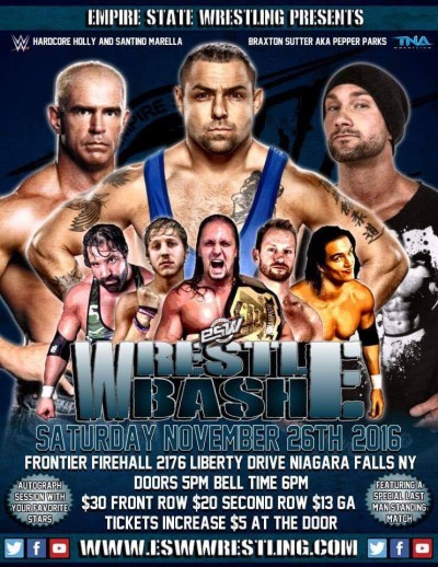 Empire State Wrestling (ESW) returns to Frontier Fire Hall, 2176 Liberty Drive, Niagara Falls, N.Y. on Saturday, November 25, featuring former World Wrestling Entertainment (WWE) superstars Hardcore Holly and Santino Marella, as well as current Total Nonstop Action (TNA) Wrestling superstar Braxton Sutter and Cruiserweight Classic participant Tyson Dux. Doors open at 5:00 p.m. with a bell time set for 6:00 p.m. Tickets are $30 for front row, $20 for second row and $13 for general admission. All tickets increase $5 at the door.