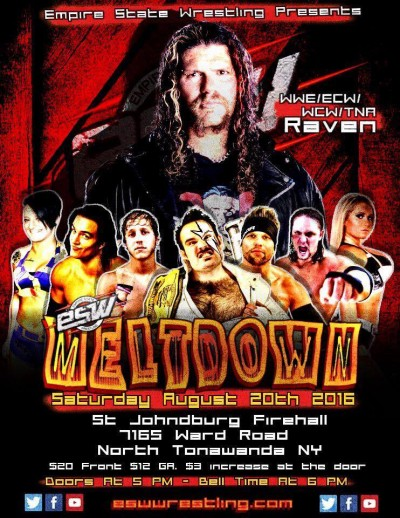 Coming off a sellout event showcasing two former WWE superstars, Empire State Wrestling (ESW) will return to the St. Johnsburg Fire Hall featuring extreme wrestling icon Raven. Pre-sale tickets are $12 and can be purchased ahead of time online at eswwrestling.com. Tickets can also be bought at the door on the day of the event for $15.