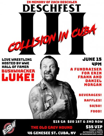 Empire State Wrestling (ESW) debuts at The Old Grey Hound, 46 Genesee Street, Cuba, N.Y. on Saturday, June 15 for "Deschfest III: Collision in Cuba". Pre-sale general admission tickets are $15. Front and second row tickets are $20. VIP tickets are $35. The event starts at 4 p.m. "Deschfest III: Collision in Cuba" will be recorded for ESW's streaming service partners.
