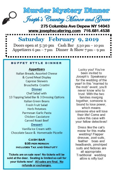 Doors and Cash Bar open at 5:30 p.m. Appetizers and clues begin at 6:00 p.m. Dinner and show begin at 7:00 p.m. We hope that you will join us for this fun, interactive and delicious dinner : )