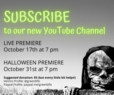 The Spooky Film Festival will stream live from GBP’s Youtube channel on October 17th and 31st at 7 pm. The suggested donation is $5, but every dollar helps to fund the theatre’s 2021 Season. Directors Leyla, Zack, Madison, and Ellen will be hosting the streams and raffling off various items, including some props used in the films. Raffles are $1 per ticket.