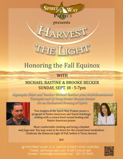 An Enchanted Evening of Spirit with Algonquin Elder and Teacher Michael Bastine and Multidimensional Therapist and Qi Gong Healer Brooke Becker. These two leaders of the Spirit Way Project weave a program of Native American and Taoist teachings, a crystal bowl sound meditation, and ending with Native American prayer. Wear comfortable clothing and perhaps bring a yoga mat and blanket as you might want lie down for the crystal bowl healing. Celebrate the Balanced Light of Fall, Before it Turns Inward.