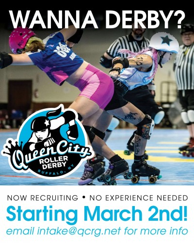Do you want to try Roller Derby but are worried about your age, size, or lack of experience? Were you an athlete in high school or college and miss team sports? Well, roller derby is for you…YES YOU! Let Queen City Roller Derby teach you the basics at our New Skater Boot Camp, beginning March 2nd. During this three-month program, you will learn how to safely skate, stop, and fall and get a start on becoming a legit roller derby player or referee. All genders are welcome! Email intake@qcrg.net for more information. Space is limited, so don’t wait!