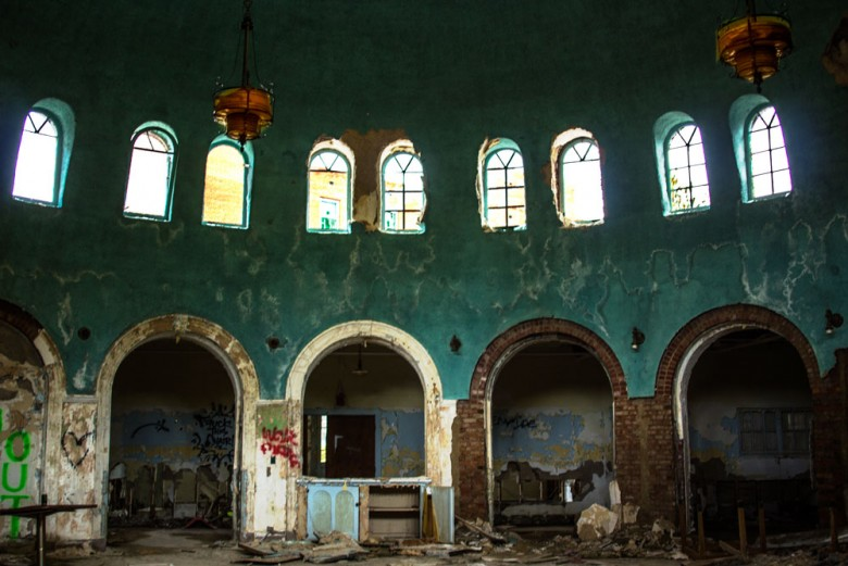 And then we entered the room I had seen in the magazine. It was even bigger than I expected. The glass dome was completely intact. Lighting fixtures hung from the high ceilings. I lifted my camera and took picture after picture after picture. The blue paint on the dome was stripped in places and the plaster rotted to expose the wood and brick frame. Water damage created white, wavy lines between the arched doorways. What a beautiful shambles!