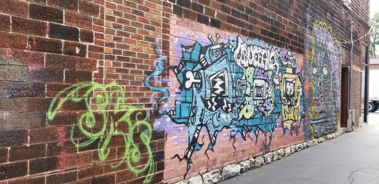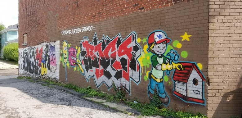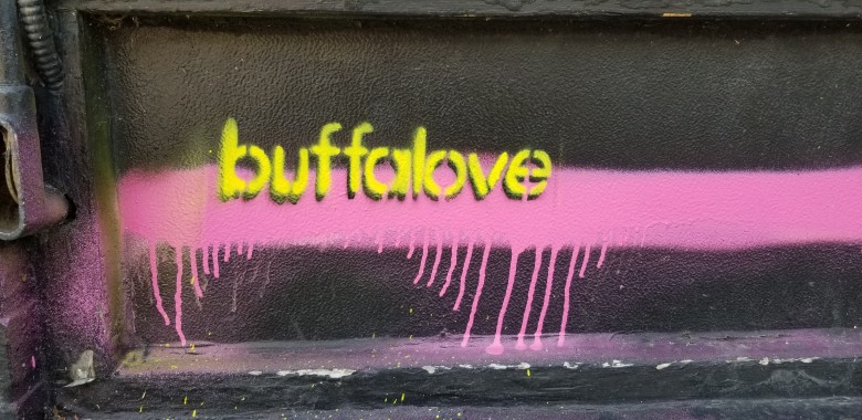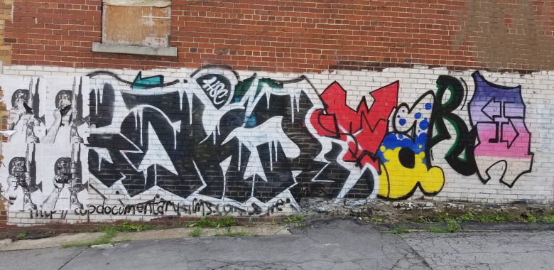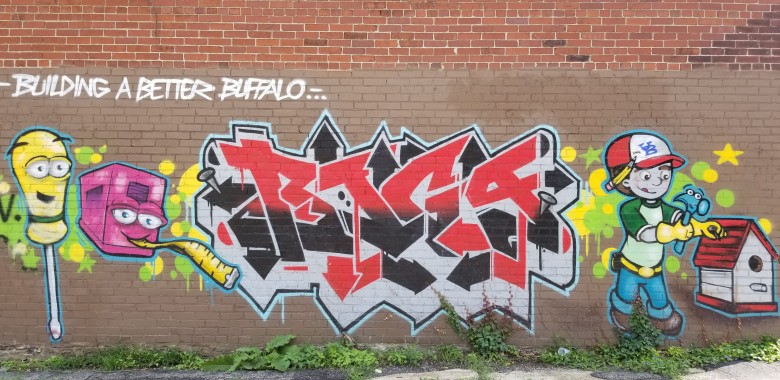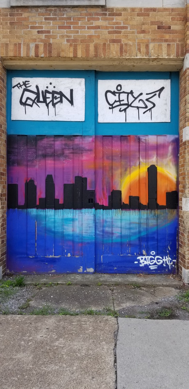 Next up is The Queen City by Bigg, two old wooden doors facing the road, decorated with the sun setting behind Buffalo’s skyline. It’s a fetching combination of stenciling, freehand spray paint with a drip effect and vintage tagging ‘font,’ reminiscent of ‘80s graffiti.