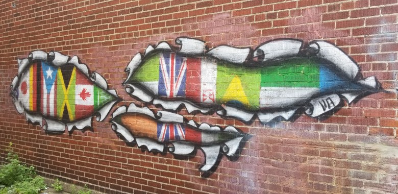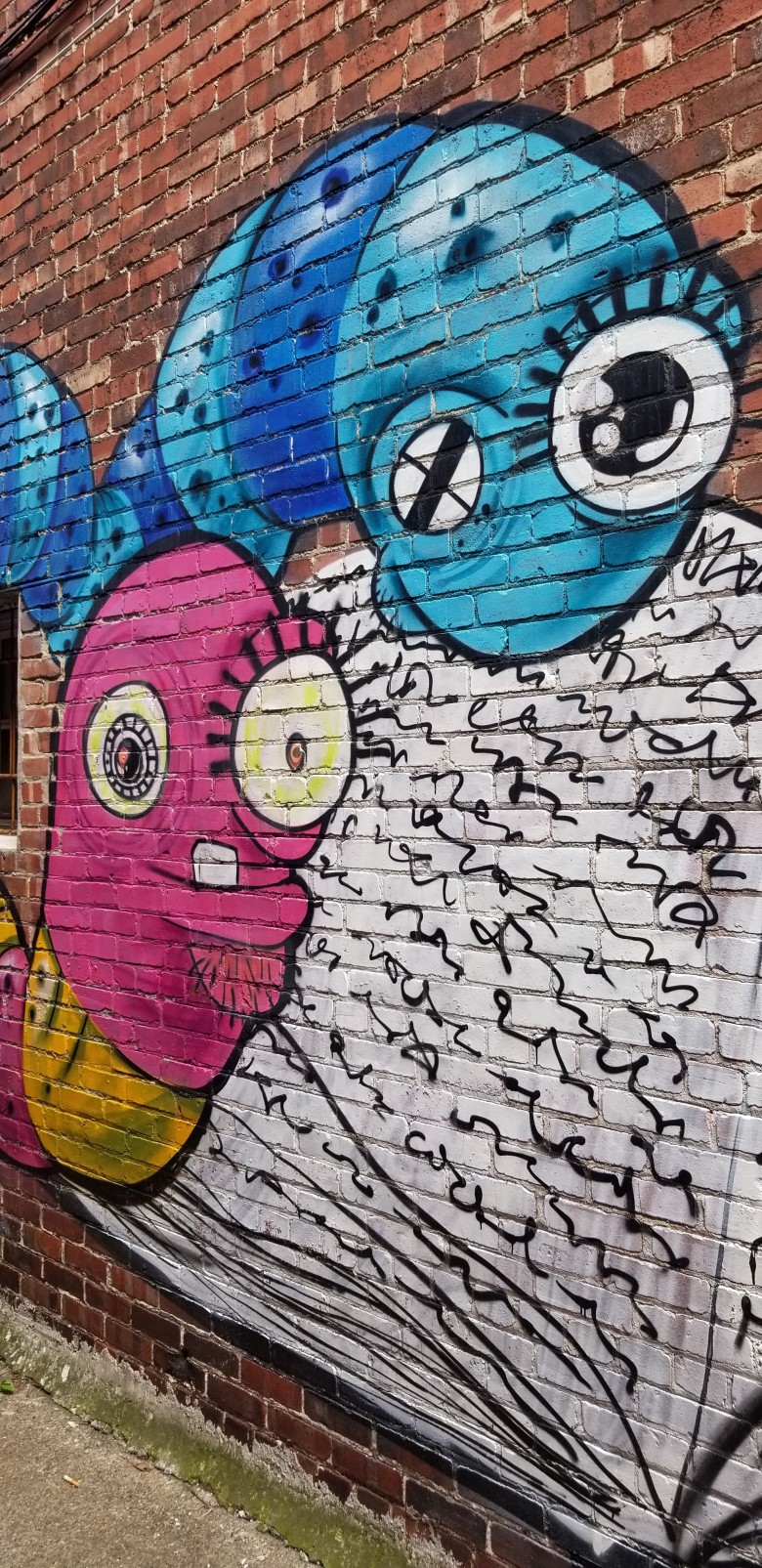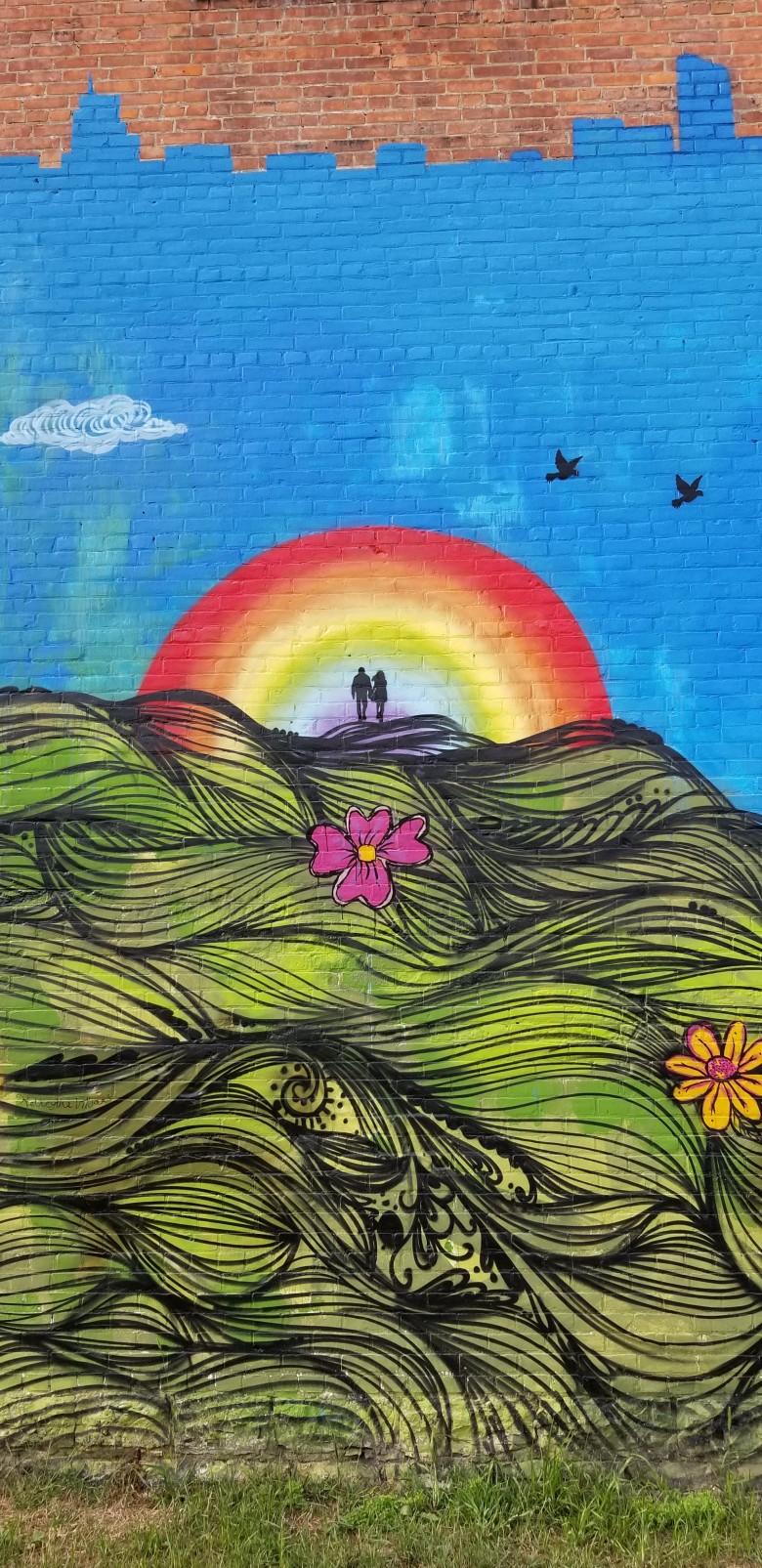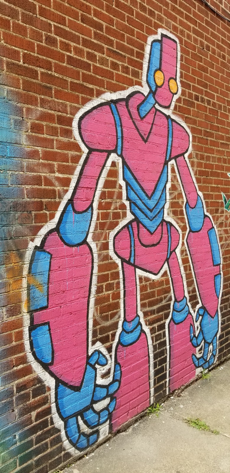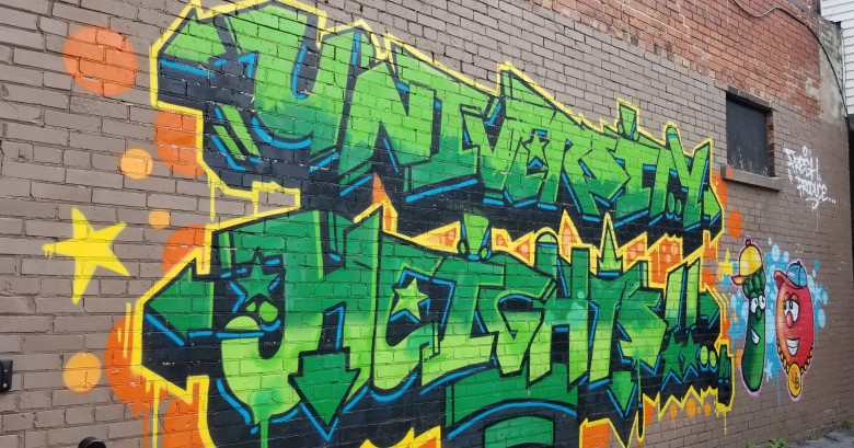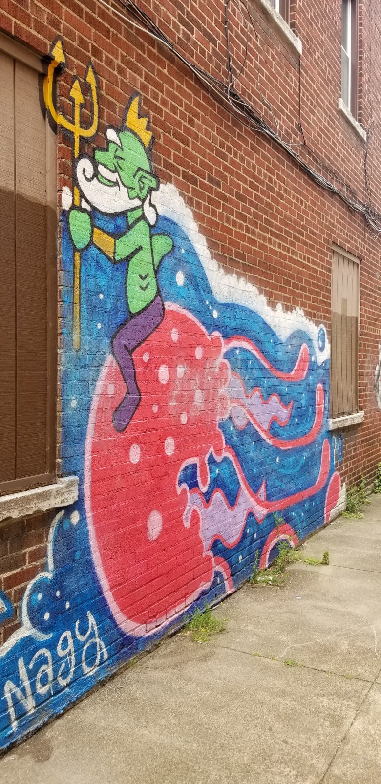 But wait; there’s more! Between the left-hand side of Doctor Birds Caribbean Rasta Rant and Queen City Imaging (3100 Main St.), two more walls of murals can be found. The first (on Doctor Birds) features faces adorned with flower crowns and foliage, alongside some colorful “bookworms;” a nod once more to the academic element of University Heights. Right across from these are the Queen City Imaging murals, which include a light post on the corner of Main Street and Education Avenue, a pink and blue robot, King Neptune Riding a jellyfish and “peeled off” sections of the wall revealing multicultural flags.