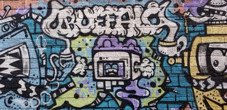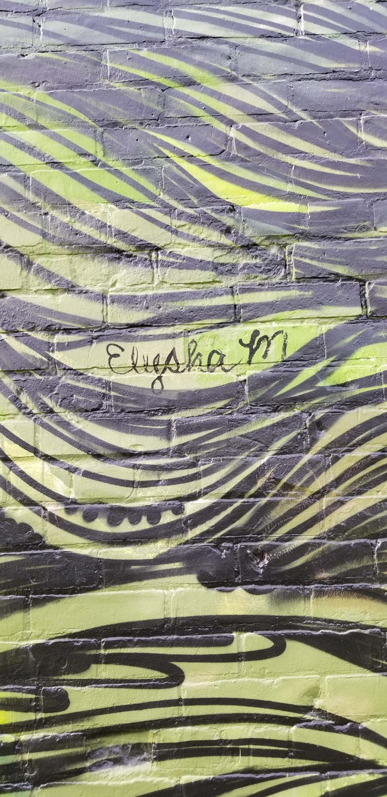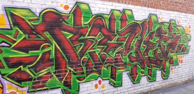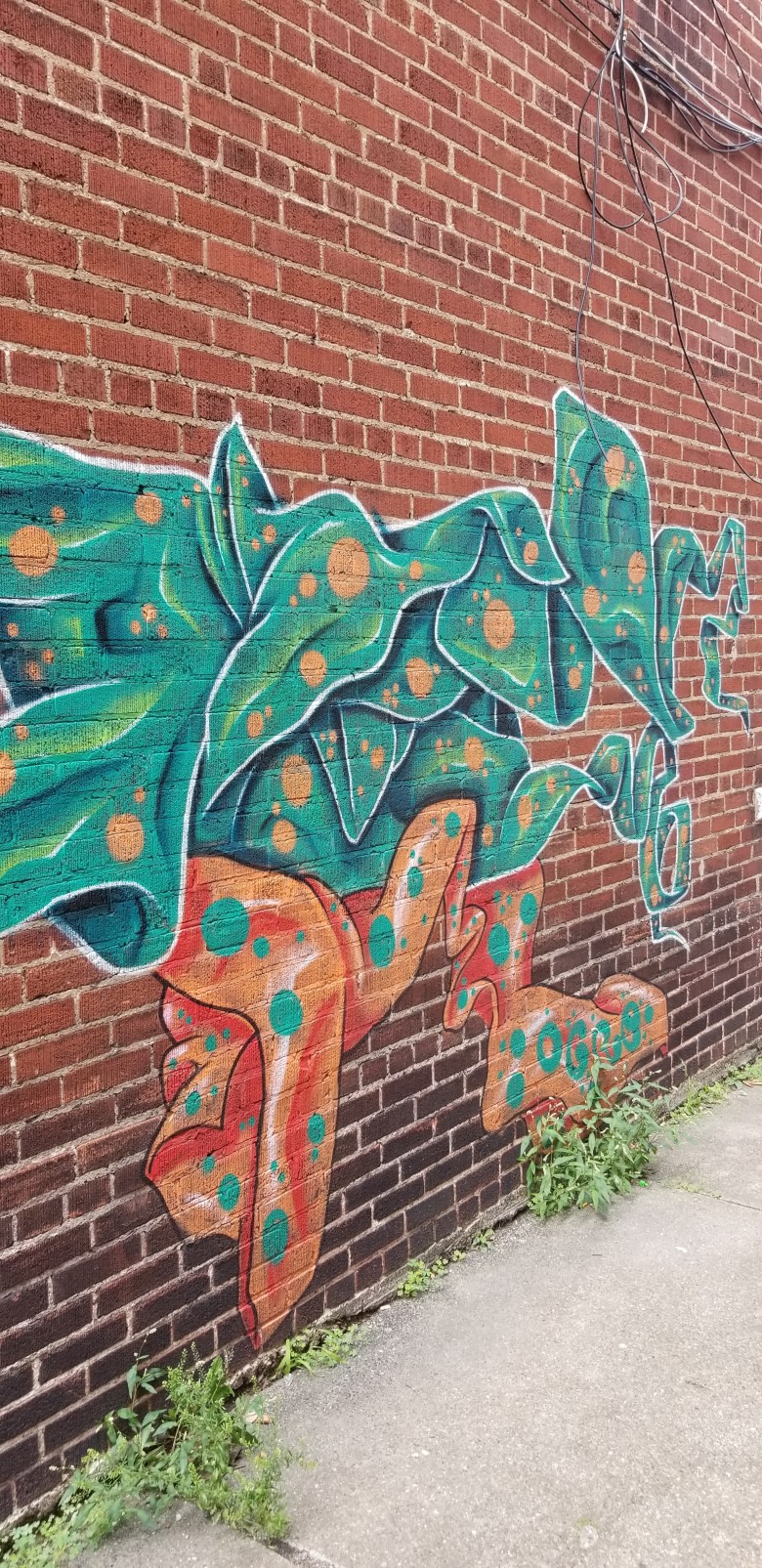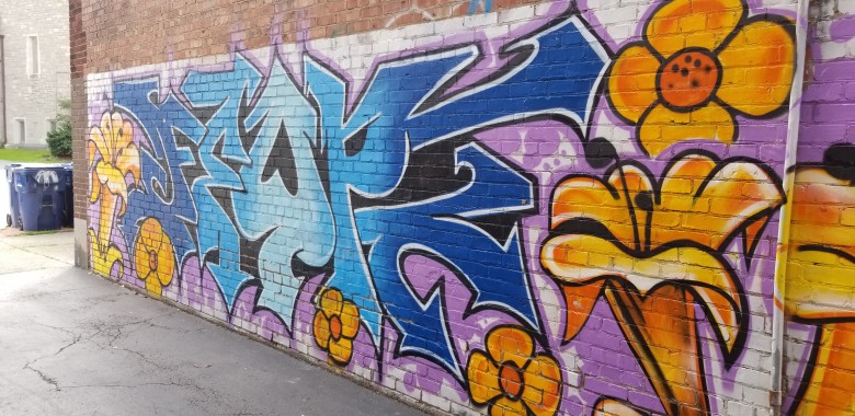 The other mural is a tribute to the classic graffiti style of intricately designed but nearly illegible characters. Nevertheless, the illustration is beautifully and neatly executed, along with vibrant yellow-orange lilies and four-petaled flowers.