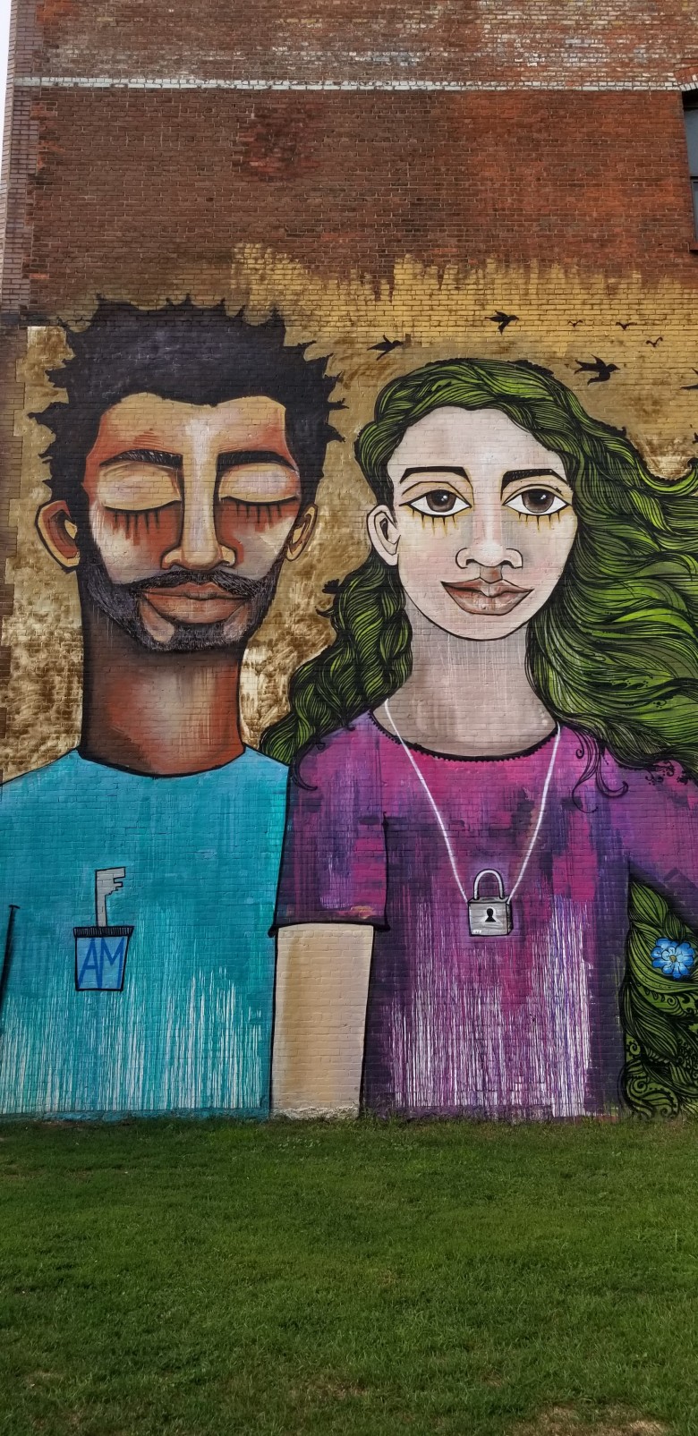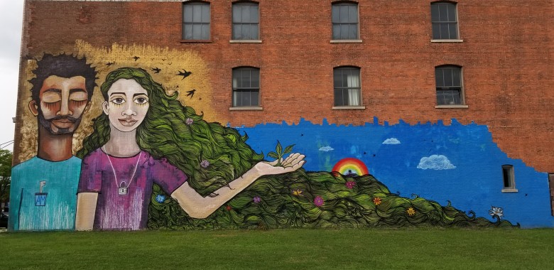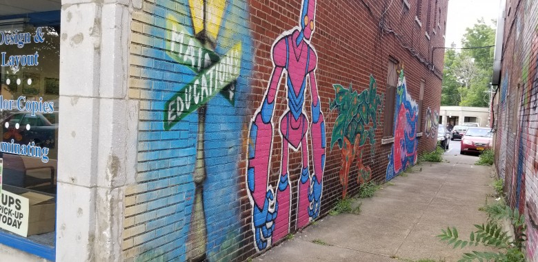 Now leaving University Heights…our next stop: The Buffalo Center for Arts and Technology, which houses a mural courtesy of the Albright-Knox Art Gallery Public Art Initiative. Dream Keepers by Alice Mizrachi and students from Mayor Byron Brown’s Summer Youth Program is a vibrant piece with messages of optimism for a flourishing future. Togetherness is symbolized by a lock around the young woman’s neck, to which her friend holds the key in his shirt pocket (note also on his pocket the artist’s initials).