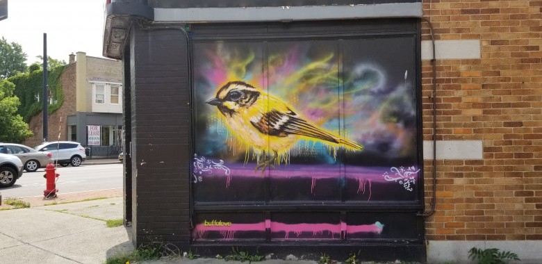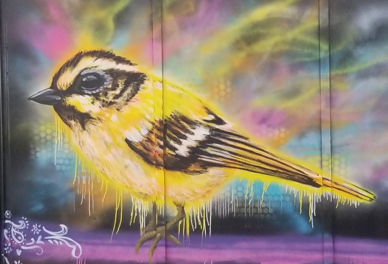 On the exterior of IconZ Hair Design is a bright and bold mural of a yellow finch; electric, no? Note also its tiny snail friend spreading a trail of Buffalove…