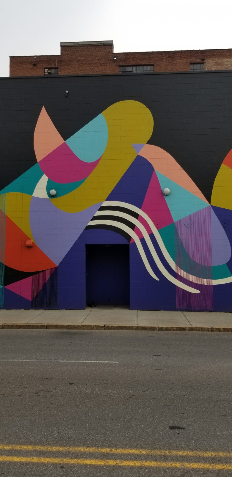 Let’s take it downtown to 710 Main Theatre, where the former black and gold “Stars of the Season” mural has been transformed into something much more colorful. Noodle in the Northern Lights by Jessie Unterhalter and Katey Truhn is an eye-catching display of stripes and abstract shapes that reflect downtown Buffalo’s roaring revival that has been taking place over the past few years.