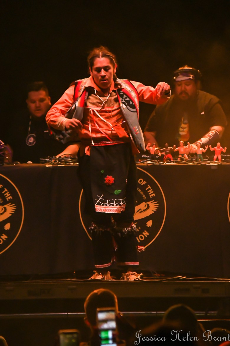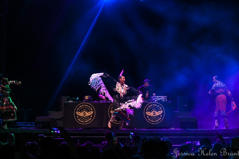 The final performance of the night featured popular DJ collective A Tribe Called Red, who invited Native American dancers on stage to interpret traditional Iroquois drum beats with EDM and live electronic drum machine samples to create powwow step sonicscapes. A Tribe Called Red gained their following through their strong stance on aboriginal rights, and their bold enterprise in battling against indigenous prejudices through Native American youth advocacy and the underground club movement.