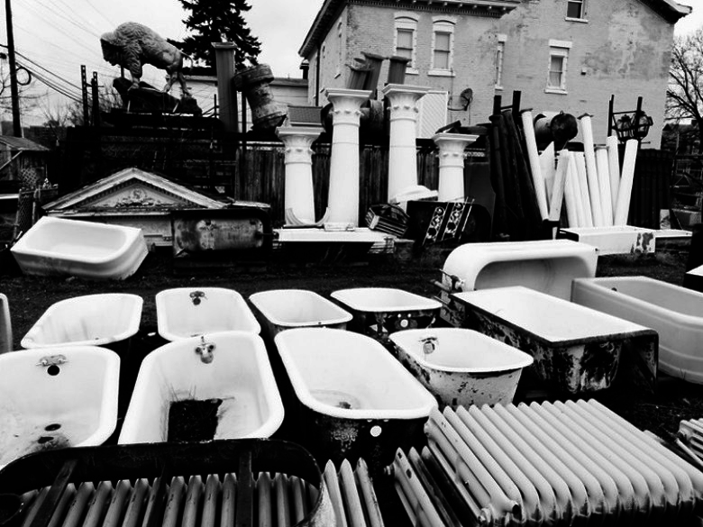 The eighteen "postcards" they send to friends in Postcards from "Buffalo The Bold" feature not only the obligatory shots of the Richardson Olmsted Complex and the rinks at Canalside, but also the delightful Gothic City yard full of bathtubs and the Elmwood Laundry, clotheslines and all.