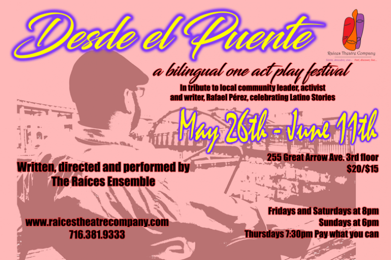 “What does it mean to be Latino?” That is the question of identity asked and answered with great feeling by a young man in the last of the ten short plays in Desde el Puente, the second annual bilingual one-act play festival by Raíces Theatre Company currently playing at the Manny Fried Playhouse. All of the plays are written, directed, and performed by members of the Raíces Ensemble, and the festival is a tribute to local community leader, activist and writer Rafael Pérez, celebrating Latino stories.