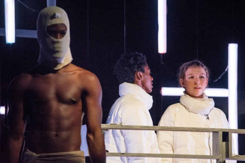 The difficulty with portraying evil on stage is that evil, in the end, is banal. For all of its permutations, it is in the end a one-trick pony. So, to make a dystopian play engaging enough for audiences to want to see it, there must be something else in the mix. In Far Away, as done by Torn Space Theater, it is the abstract, absurdist production values that give it life, along with the cleverness of the script in Act One and Act Three. And, of course, those dancing bag-heads.