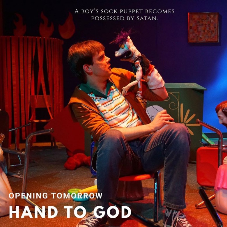 A foul-mouthed little devil has taken up residence in the form of a sock puppet named Tyrone at Road Less Traveled Theater in the riotous comedy Hand to God. If you like your comedy broad, biting, irreverent, and so funny you can barely stand it, Tyrone will be creating havoc there just for you for the next four weeks on the hand of Dan Urtz, who astonishes in a flawless performance as the adolescent Jason in thrall to the little demon.