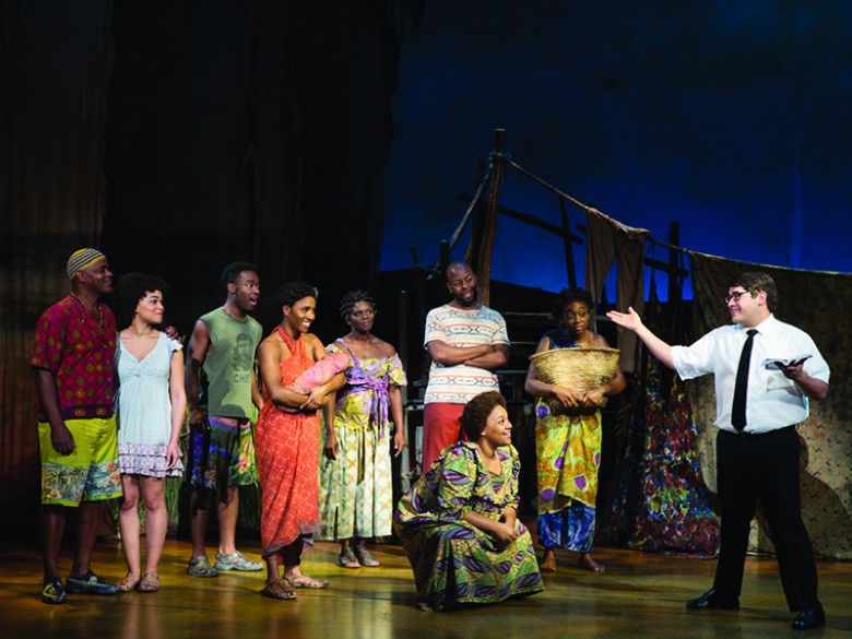 Liam Tobin as Elder Price has a perfect blend of youthful enthusiasm and cluelessness and packs a mouthful of pearly whites that he displays with great pride. Colgate would pay megabucks be able to use him in commercials. Jordan Matthew Brown exhibits all the nebbish-y qualities of Arnold, idolizing his partner Price, displaying his lack of self-esteem, then digging deep inside to come up with some really great lies. Kayla Pecchioni is the lovely Nabulungi, sometimes known as Neutrogena, among other names. She is a delight in her sweet innocence, texting away on her portable typewriter. Her song, “Sal Tlay Ka Siti,” while very funny, is overlaid with a longing for peace, prosperity and love. In smaller, but no less well played roles, are Mike McGowan as the baritone warlord, General ************, Andy Huntington Jones as the repressed Elder McKinley, and Jacques C. Smith as the village leader, Mafala.