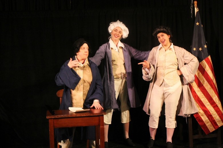 As the beauty queen, Katherine with her big hair, tall slender frame and stiletto heels, Stefanie Warnick towers over the others in her American flag pageant costume. She smiles and preens and has just the right amount of Southern beauty queen panache to set your teeth on edge. She plays this role as if she were born to it. She also plays George Washington, who declares whenever the occasion arises, “Am I right? Of course I am. I’m George Washington!” And she is the shrewish Martha and seductive Dolly Madison, as well as doing Sound Design and Fight Choreography.