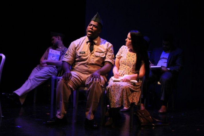 Violet meets two soldiers who are traveling together on the bus. Monty is a young, white corporal on the make, and Flick is a more mature, Negro sergeant (remember it is 1964 in the South). Her journey takes on deeper meaning as she vacillates between the two, unsure if she can have more than the fleeting sexual encounter she has experienced in the past. But she is no pushover. She has determination and grit, as when Flick is disrespected at a stopover by the waiter in a diner. Violet intervenes on his behalf, tells Flick not to make a big deal of it, and then challenges the soldiers to a game of poker. While they play, a flashback scene with young Violet and her father takes place, as he teaches her poker as a way of learning math, with the song “Luck of the Draw.” It is a very witty, complex piece that Jeffrey Coyle as the father does expertly, singing and talking while dealing and shuffling cards.