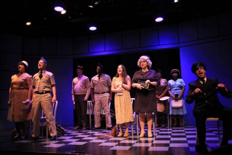 Direction is by Susan Drozd. Her juxtaposition of present and past scenes is very well done. While they take place simultaneously, each is clearly delineated in a way that makes it possible for the audience to “get” each one. The unseen musicians, directed by Theresa Quinn, are excellent. The set design by Chris Schenk works very well for the bus and and various diners, bars, and boarding house. Loved the blinking sign.
