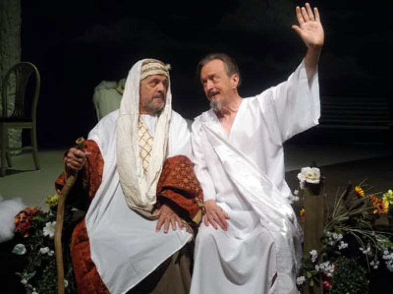 The last play, Way Back When, is the story of God’s demand that Abraham sacrifice his only son, Isaac, to prove his faith. Jon Summers is very good as Abraham, who really really wants to be the founder of a civilization but loves his son very much. His wife, Sarah (Kathleen Rooney), kvetches with him about God’s complete lack of consideration for them. They come up with a plan to save Isaac and trick God (David Lundy). Does it work? Well, yes and no. I found their excitement and self-congratulations at the bright idea of substituting a slave boy for Isaac to be disturbing, although slavery was the done thing at the time.