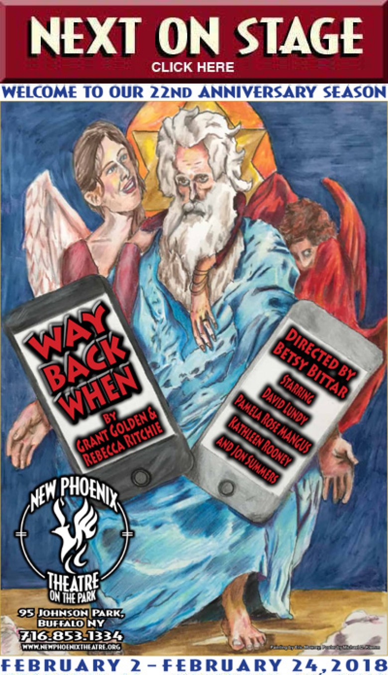 The New Phoenix Theatre Company opened Way Back When, An Evening of One Acts, three plays by local playwrights Grant Golden and the late Rebecca Ritchie this week. All are directed by Betsy Bittar, in her first outing directing a full production. The plays are based on biblical stories and characters.