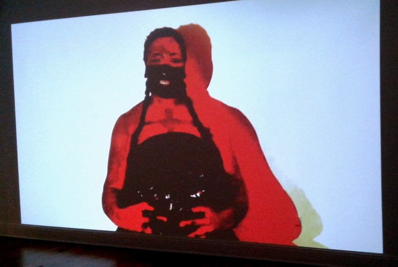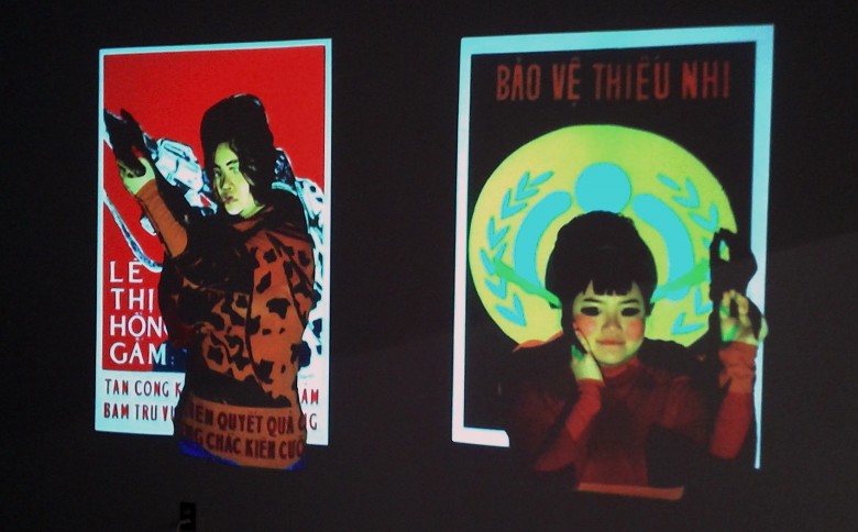 Other artists in the exhibit engage with concepts of space and time. Van Tran Nguyen, a recent SUNY graduate and PhD candidate at Rensselear Polytechnic Institute, superimposes herself over projected historical Vietnamese propaganda posters that depict women in contrary binaries — as the protector and the protected. While Dana McKnight, founder of Buffalo’s Dreamland Arts, imagines a futuristic, black matriarch that speaks only in Morse code, delivering a message about employing the Geechee and Sioux methods of “drum and smoke to confuse the enemy.” Just as its digitized iconic imagery projects a hypothetical future, the work simultaneously invokes the past, recalling Solomon Brown, the black scientist who worked with Charles Morse to develop his coded language. (And what is art but coded language, a subversive and covert form of communication?) Kalpana Subramanian, a PhD candidate at SUNY Buffalo, has created a “soundwalk” that welcomes users to walk through Allentown while listening to a sound collage of field recordings on a downloadable app. Just as Nguyen imposes herself over propaganda posters, Subramanian imposes the sounds of Indonesia, Japan, and India over a Buffalo neighborhood. (Subramanian will lead a guided tour through of her piece later this month. See the end of this article for details.) These works bend time and space — forwards and backwards, near and far — to consider the roles of language, space and identity in times of resistance.