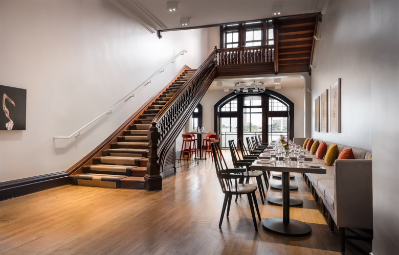 Dinner done, we had been sitting for several hours. No one wanted to leave, but we had to move around a bit. A tour of the premises was in order. We first checked out the rooms in the restaurant—the bars were booming, dark and atmospheric with a separate area for diners. We ventured out onto the patio—deserted on a cool September night. The patio looks south over the campus and I could envision lunch on a bright summer day. Upstairs we found the hotel. The architects have preserved the integrity of the massive building, retaining high ceilings, wide corridors, sweeping staircases and tall windows. We discovered a beautifully restored stone fireplace. Generous seating areas with flat screen TVs welcome visitors and guests alike.