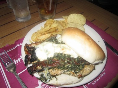 My gal-pals went with sandwiches, which are all named after local streets, quite a charming touch. These sandwhiches were gobbled up and got rave reviews. Erin ordered “The Delaware” (grilled chicken with spinach and provolone), and Carly went with “The Edward” (grilled chicken with spinach and blue cheese). They were both served on a hearty bun and came with chips on the side (minus one! fries would have been so much better!).