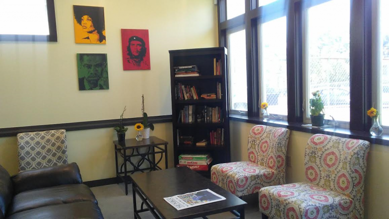Wholly Crepe's walls are bedecked with illustrations by street artist Shepard Fairey, promoting a culture of social responsibility and forward thinking. The biographies of Malcolm X, Che Guevara, and other revolutionaries fill a bookcase near a window where a cascade of sunlight filters into the space, opening the room. Students are encouraged to participate in a "take a book, leave a book" policy of learning.